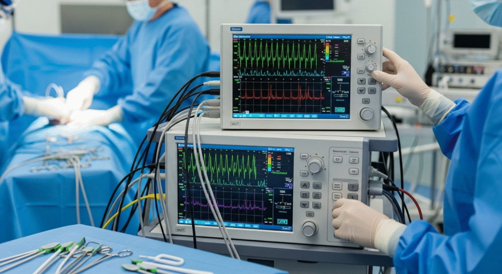 Our services use FDA-cleared neurophysiological monitoring platforms designed for accuracy, redundancy, and adaptability. From multi-channel EEG and EMG systems to transcranial motor evoked potential stimulators, our equipment captures high-fidelity signals essential for detecting early changes in neural function. Continuous software analysis provides immediate visual and auditory alerts, allowing the surgical team to respond in real time.